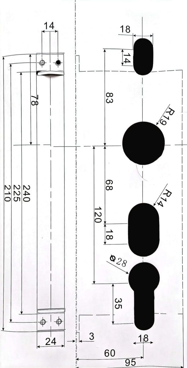 Ez a kép egy zárszerkezet sablont ábrázolja, tehát egy ajtózár kivágásának pontos méreteit mutatja. A sablon segítségével a lakatosok pontosan